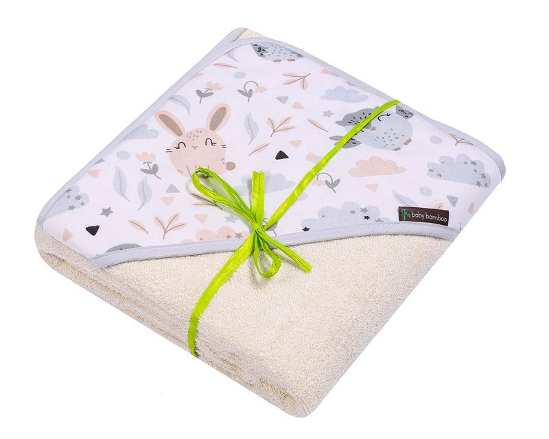Bambukinis rankšluostis kūdikiui "Baby bamboo" su gobtuvu 100x100 cm su pelėdžiukais, šv. gelsvas