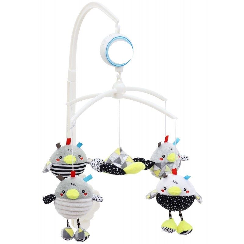 Karuselė prisitvirtina prie kūdikio lovytės grotelių. Galima nustatyti kabančių minkštų žaisliukų aukštį pagal poreikį. Užvedus mechanizmą pakabinti žaisliukai sukasi ratu ir groja muzika.