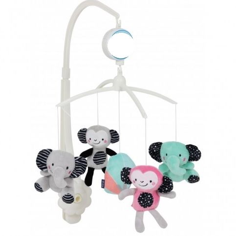 Karuselė prisitvirtina prie kūdikio lovytės grotelių. Galima nustatyti kabančių minkštų žaisliukų aukštį pagal poreikį. Užvedus mechanizmą pakabinti žaisliukai sukasi ratu ir groja muzika.