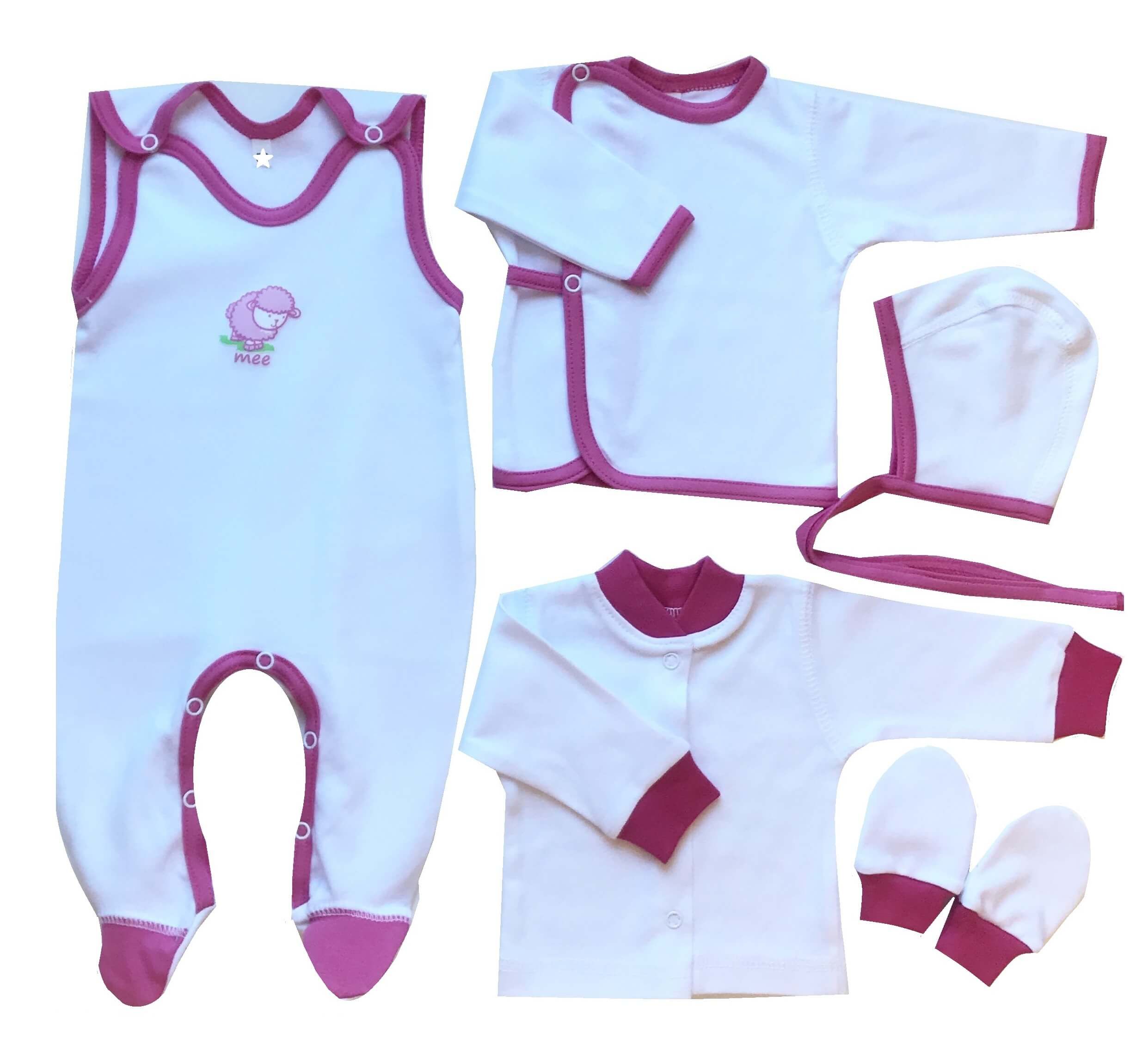 Šliaužtinukai, marškinėliai, švarkelis - tai yra patys pirmiausi naujagimio drabužėliai. Šliaužtinukai visai nevaržo kūdikio judesių, patikimai prilaiko marškinėlius, laiko nugarą ir kojytes šilumoje. Komplektą sudaro taipogi pirštinytės, kurios apsaugos mažylį nuo apsidraskimo. Drabužėliai yra pasiūti iš kokybiškos trikotažinės medžiagos, malonios prisilietimui ir nedirgina net pačios jautriausios ir švelniausios kūdikio odelės.