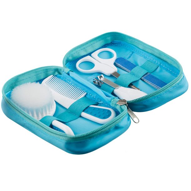 Priemonės skirtos kūdikiams nuo pat gimimo. Komplekte yra saugios žirklės, dildelė, žnyplytės ir šukos ir šepetys plaukams.