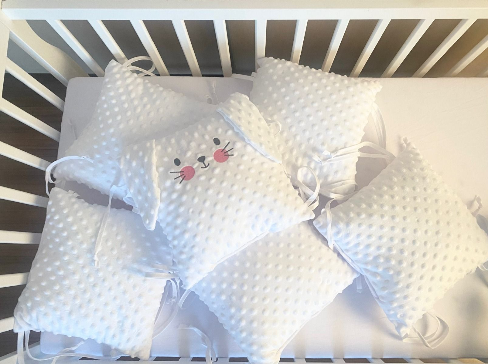 Lovytės apsaugėlė susideda iš 6 pagalvių 30x30 cm dydžio, viena pagalvėlė su zuikučio aplikacija, kitos 5- vienspalvės.