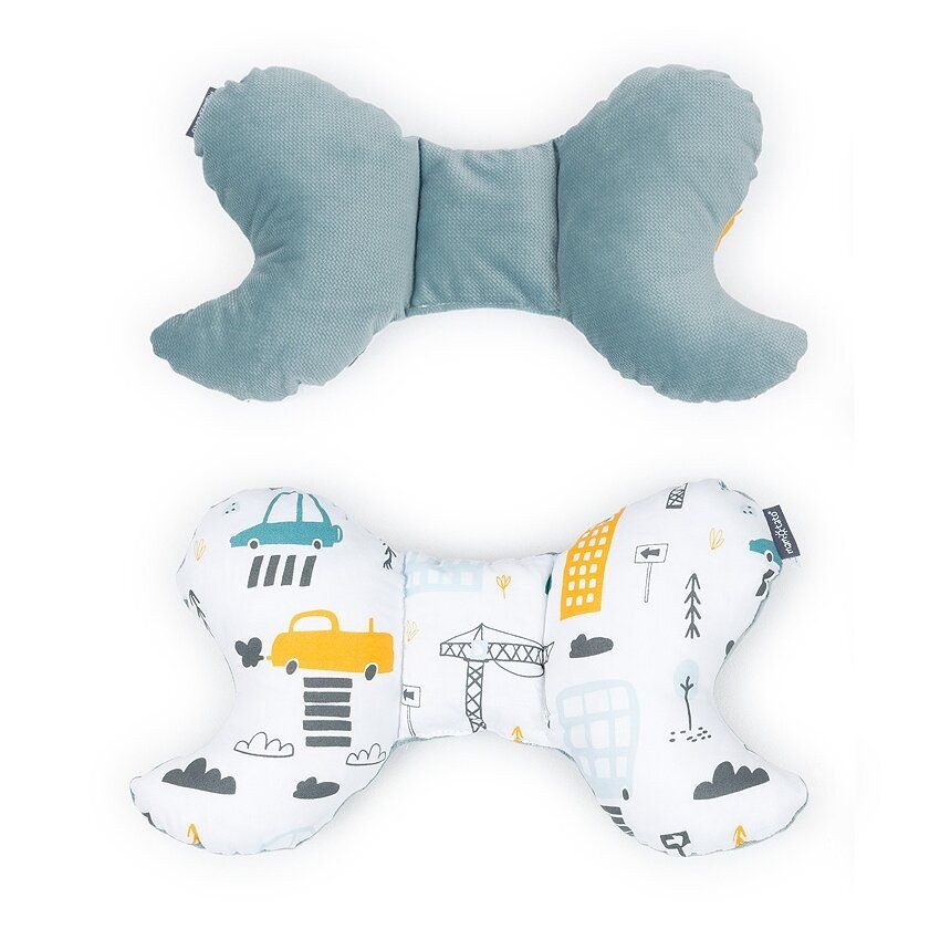 MamoTato pagalvė vežimėliui, miestas, pilkas MamoTato dvipusė anti-šoko pagalvėlė Motylek, ideali vaikams ir suaugusiems kelionėse.