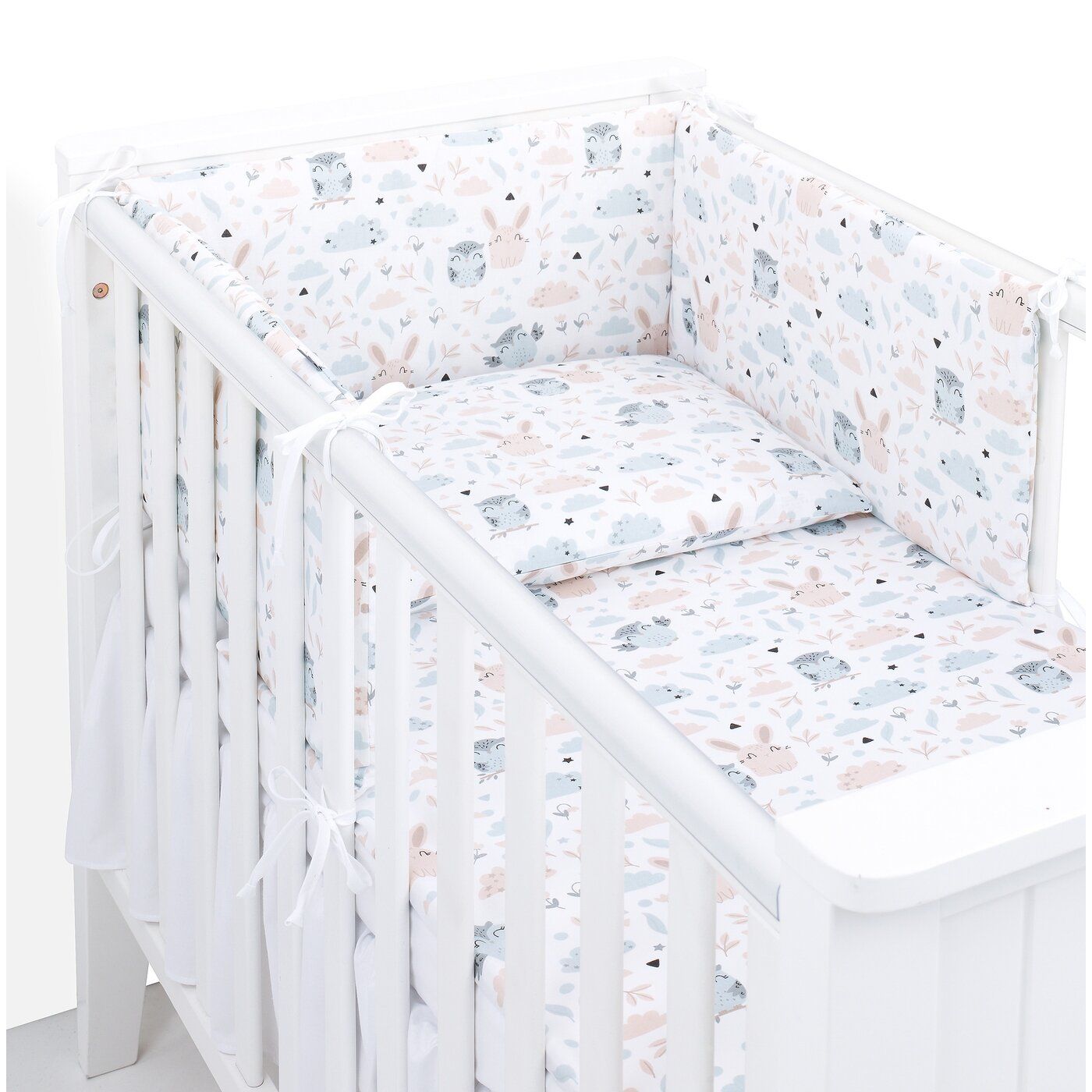3. Lovytės apsauga 30x190cm su nuimamu užvalkalu. Gali būti naudojama iš abiejų pusių. Apsauga turi 8 ilgus, gerai prisiūtus diržus, kurių dėka ją galima tvirtai pritvirtinti prie lovelės.