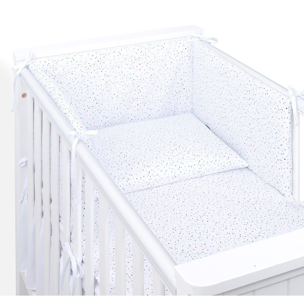 3. Lovytės apsauga 30x190cm su nuimamu užvalkalu. Gali būti naudojama iš abiejų pusių. Apsauga turi 8 ilgus, gerai prisiūtus diržus, kurių dėka ją galima tvirtai pritvirtinti prie lovelės.
