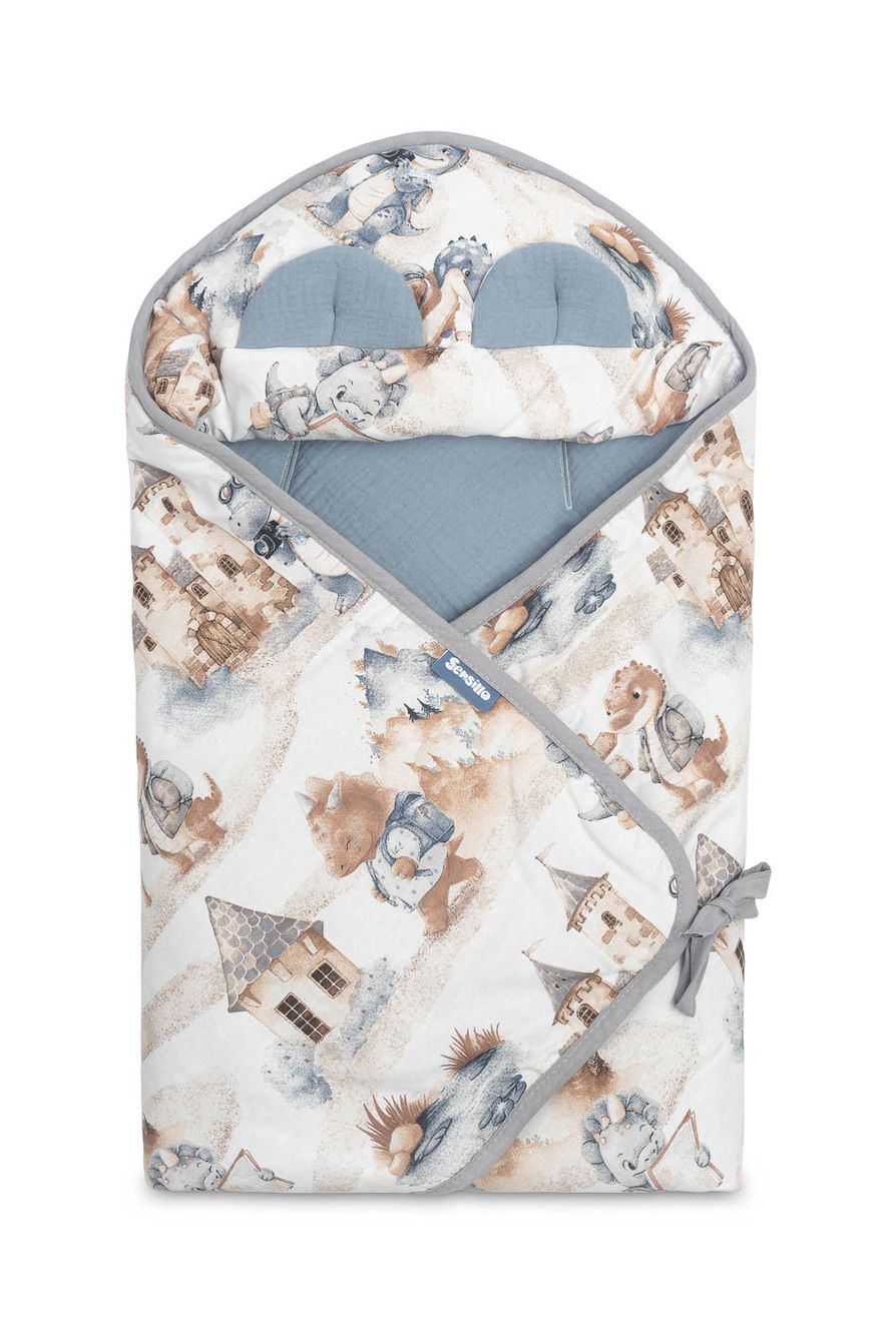 Šis muslino pledukas buvo sukurtas galvojant apie mūsų pačius mažiausiu. Jis patogus ir šiltas, o taipogi labai praktiškas. Tai gali būti alternatyva šiltiems vaikų drabužiams. Dėl 3 taškų dirželių skylių jis yra labai funkcionalus - gali būti naudojamas tiek automobilinėje kėdutėje, tiek vežimėlyje. Ji galima naudoti taipogi kaip voką vežimėlyje. Jis užpildytas antialerginiu užpildu.