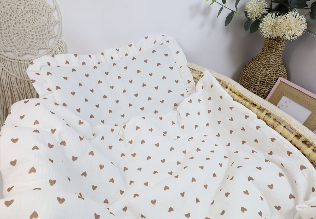 Muslino komplektas susideda iš užklotuko/antklodėlės ir pagalvėlės su raukinukais – skirtas lopšiui, „Mozės“ krepšiui, vežimėliui.