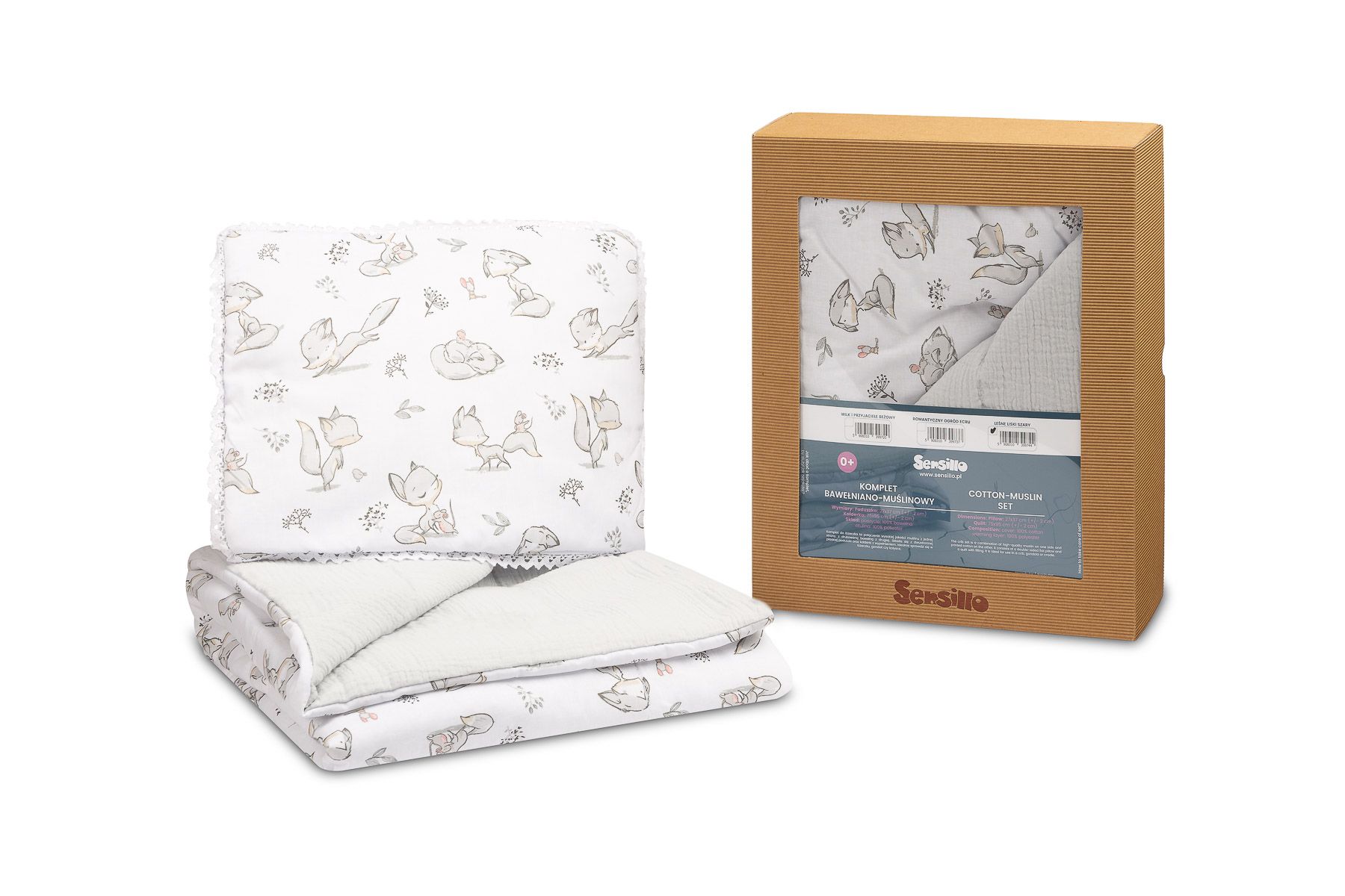 Rinkinukas "Foxy" pagamintas iš aukščiausios kokybės muslino, iš vienos pusės, ir medvilnės, iš kitos. Šis elegantiškas derinys pasižymi klase, kokybe ir praktiškumu. Komplektėlį Friends sudaro dvipusė plokščia pagalvė ir antklodė su antialerginiu silikoniniu pūkeliu - užpildu. Matmenys buvo parinkti taip, kad jis puikiai tiktų naudoti lovytėje ar lopšyje ir netgi taptų „mėgstama antklode“, kurią galima naudoti vežimėlyje ar lovytėje. Skandinaviško stiliaus dėka rinkinys tinka kiekvienam vaikų kambariui. Audiniai, iš kurių pagamintas rinkinys ir užpildas, yra sertifikuoti OEKO-TEX 100.