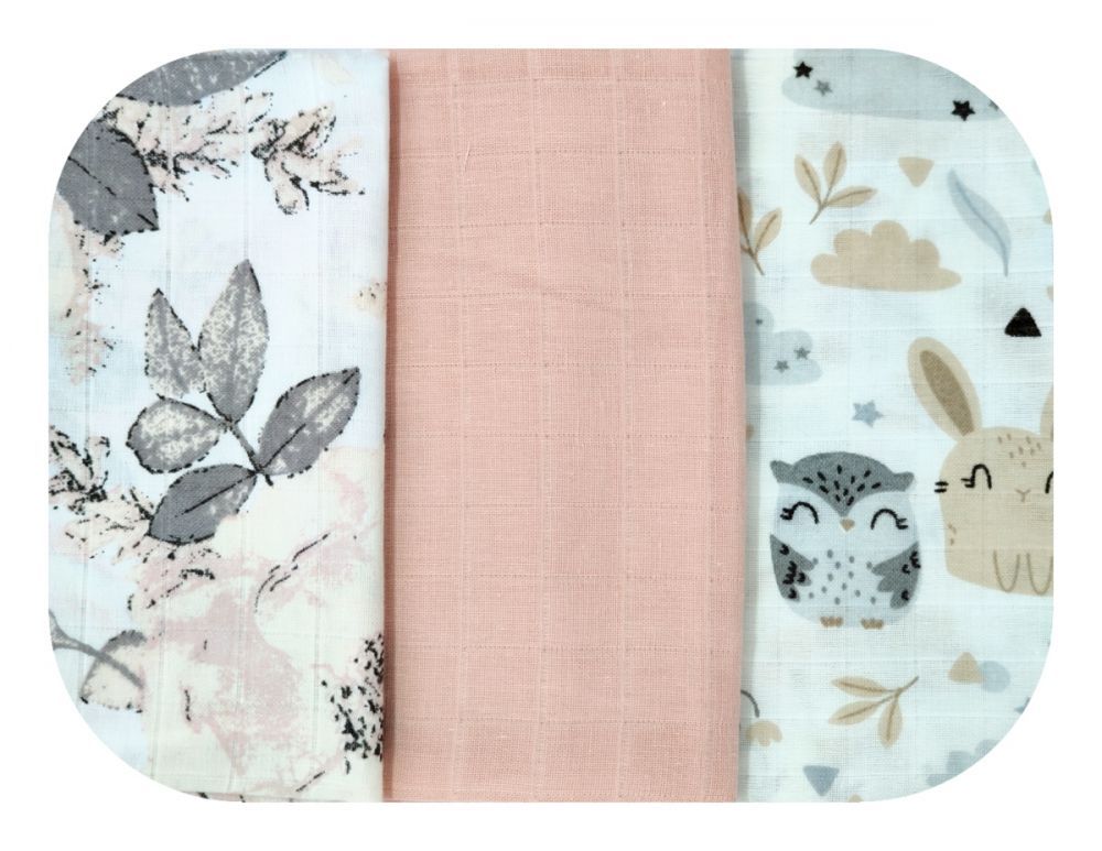 Komplekto sudėtis: 3 vystyklai iš marlės 60x80 cm