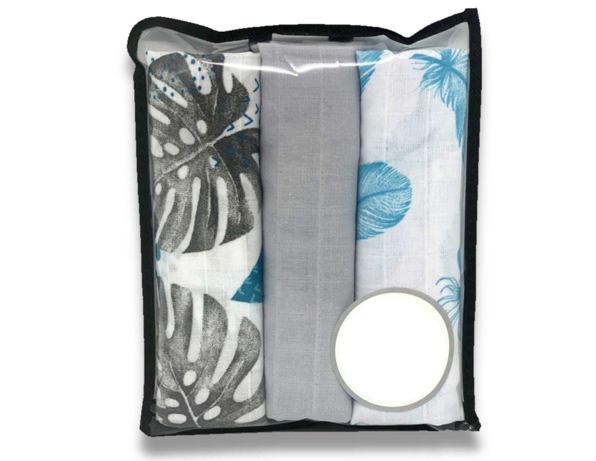 Aukščiausios kokybės natūralios medvilnės, trijų minkštų muslino vystyklų rinkinys. Kiekvieną rinkinį sudaro du vystyklai su raštu ir vienas vienaspalvis. Rinkinys supakuotas į permatomą maišiuką su užtrauktuku.