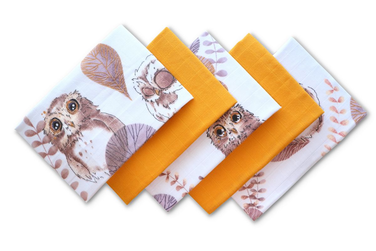 Muslino vystyklų rinkinys kūdikiams "Mini" 5 vnt 38x38 cm Owls yellow