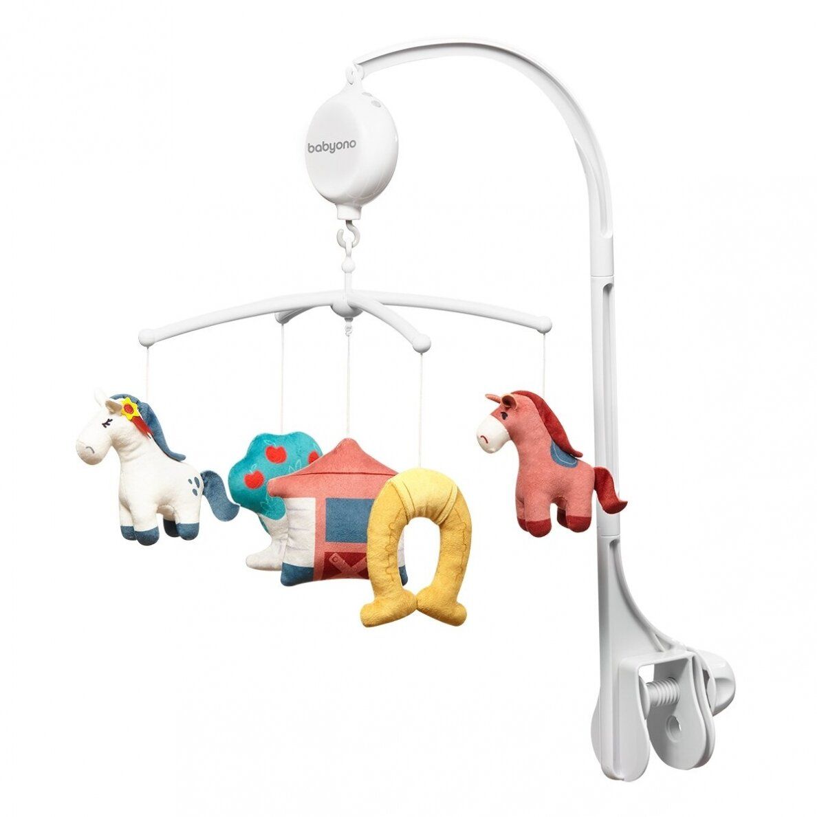 Karuselė prisitvirtina prie kūdikio lovytės grotelių. Galima nustatyti kabančių minkštų žaisliukų aukštį pagal poreikį. Užvedus mechanizmą pakabinti žaisliukai sukasi ratu ir groja muzika.