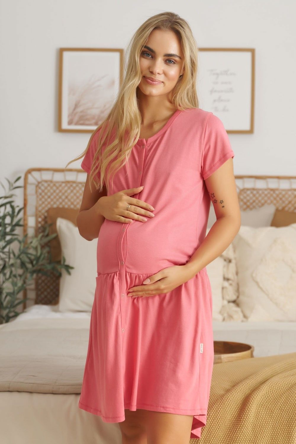 Naktiniai su apvalia iškirpte ir asimetrine nugara. Dvi praktiškos kišenės marškinėlių priekyje, puikiai tinka telefonui ar servetėlėms Praktiškas kirpimas, kuris pasiteisins nėštumo metu bei pirmosiomis savaitėmis namuose. Leidžia diskretiškai žindyti kūdikį Patogi, minkšta ir maloni liesti medžiaga.