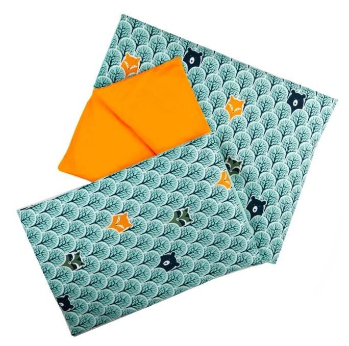 Kuku patalynės viena pusė pagaminta ir margos medvilninės medžiagos su nupieštu lapiuku, meškiuku ir meškėnu, kita pusė vienspalvė. Užvalkalas kūdikio pagalvei margas.