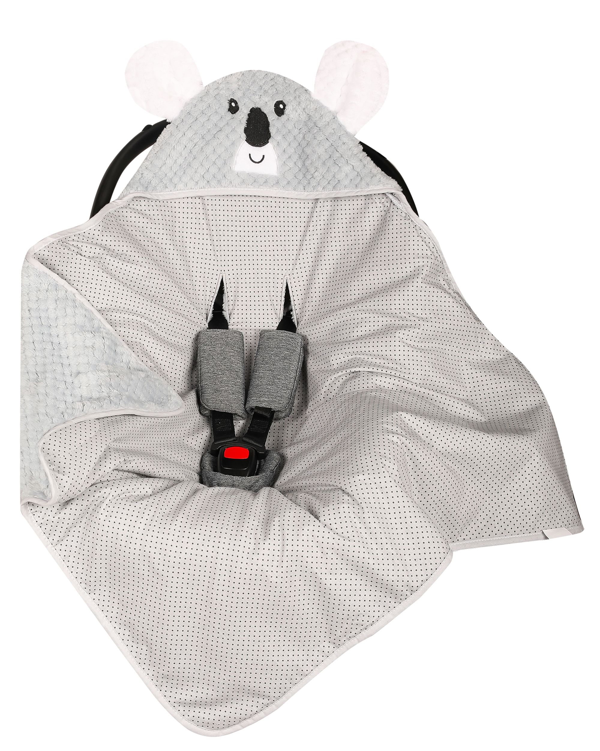 Aprašymas Pledas automobilinei kėdutei "Animals & Dots" 80x80 cm pilkos spalvos pliušas su aplikacija, kita pusė pilkos spalvos medvilnė su taškiukais