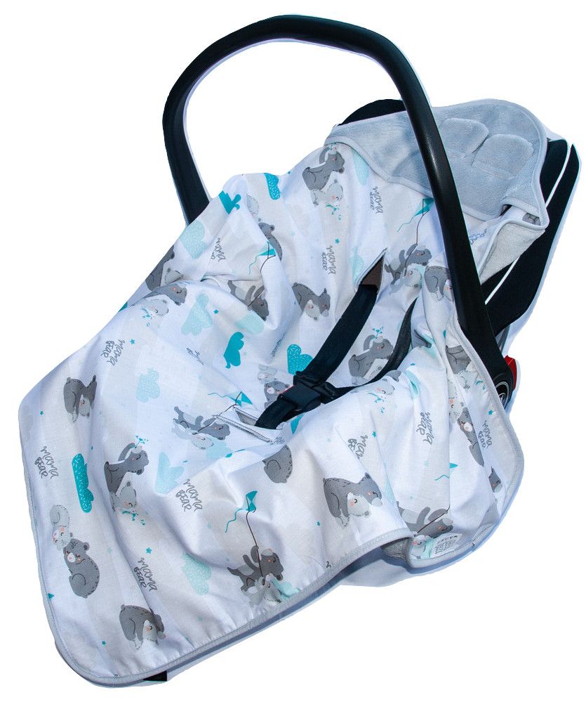 Aprašymas Pledas automobilinei kėdutei "Mama bear" 80x80 cm pilkas su balta medvilne ir meškiukais