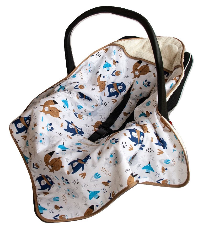 Aprašymas Pledas automobilinei kėdutei "Forest" 80x80 cm bežinis pliušas, baltas fonas su melsvais miško gyvūnais