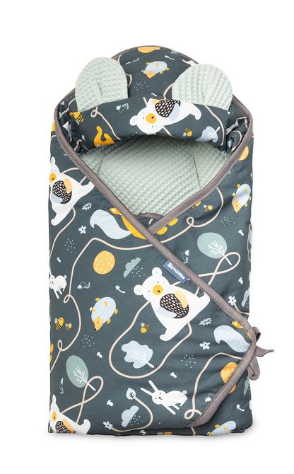 Šis pledukas buvo sukurtas galvojant apie pačius mažiausiu. Jis patogus ir šiltas, o taipogi labai praktiškas. Tai gali būti alternatyva šiltiems vaikų drabužiams. Dėl 3 taškų dirželių skylių jis yra labai funkcionalus - gali būti naudojamas tiek automobilinėje kėdutėje, tiek vežimėlyje. Ji galima naudoti taipogi kaip voką vežimėlyje. Apkloto viršuje yra įsiūtos žavios ausytės. Jis užpildytas antialerginiu užpildu. Pledukas kūdikiui pagamintas iš kokybiškos medvilnės, viena pusė - lygi klasikinė medvilnė, kita pusė iš vaflinės medvilninės medžiagos.