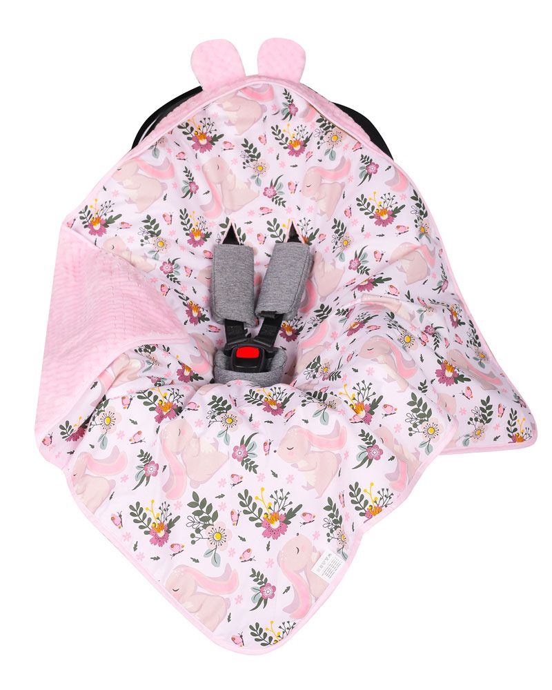 Aprašymas Pledas automobilinei kėdutei "Bunny and flowers" 80x80 cm rožinės spalvos pliušas ir balta medvilnė su zuikučiais