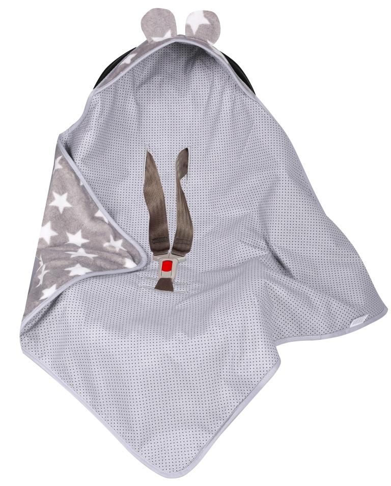 Aprašymas Pledas automobilinei kėdutei "Stars & Dots" 80x80 cm pilkas pliušas su žvaigždutėmis, kita pusė pilka medvilnė su taškiukais