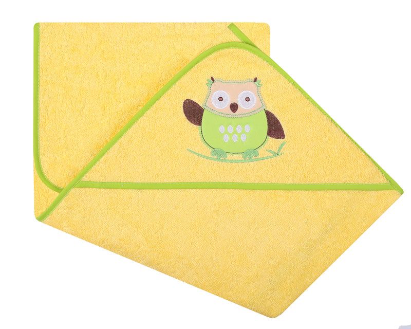 Rankšluostis kūdikiui "Owl" su gobtuvu 80x80cm geltonas