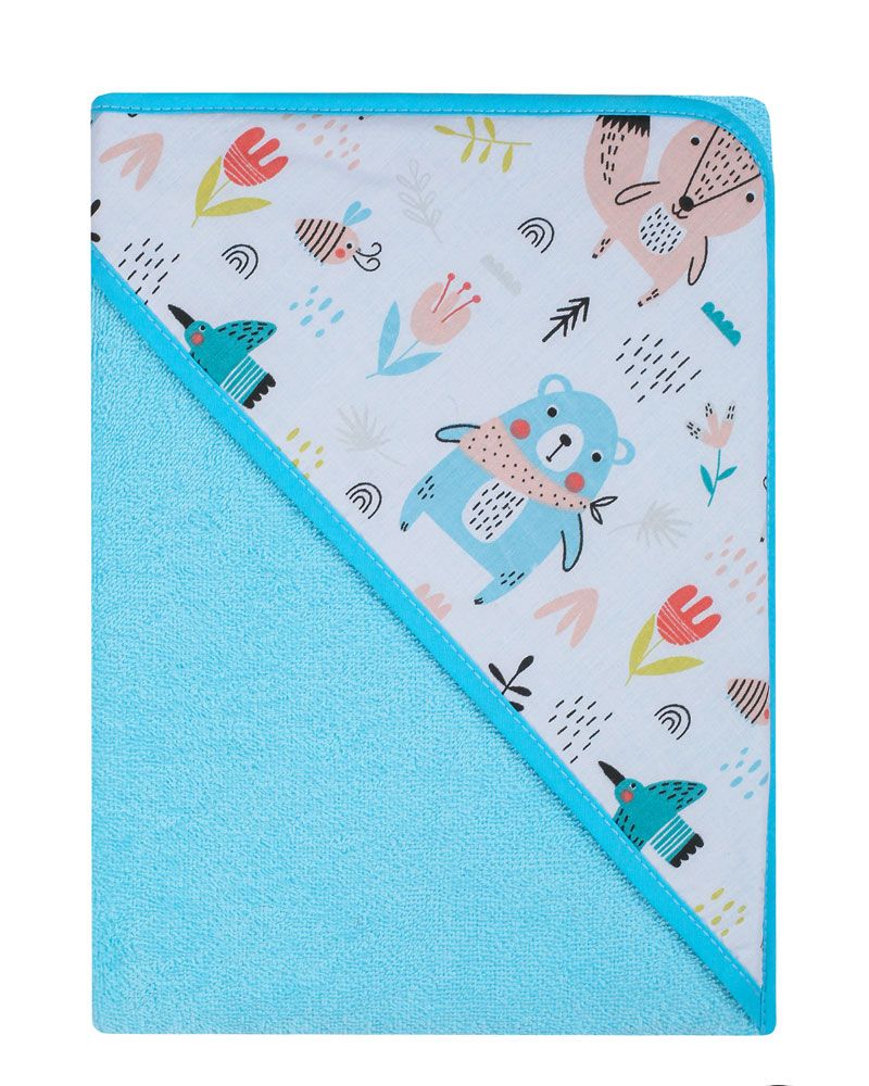 Rankšluostis kūdikiui "Fox & Bear" su gobtuvu 80x80 cm "frotte" turkio spalvos