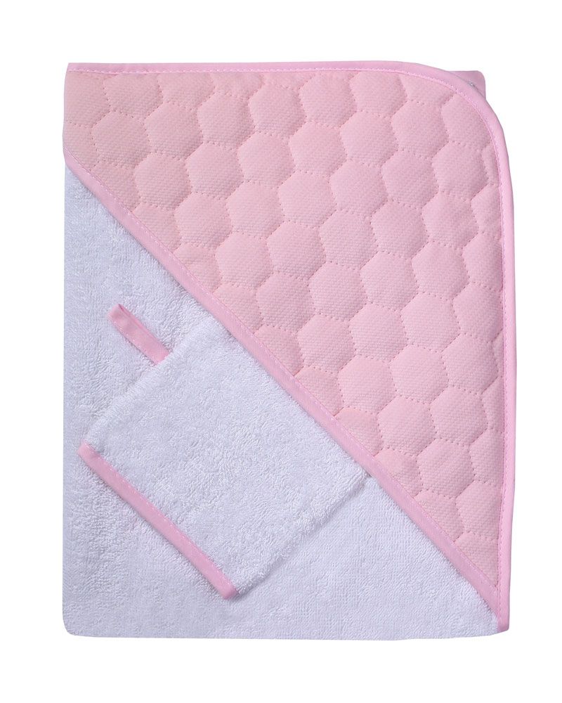Rankšluostis pagamintas iš minkštos, pukuotos 100% medvilnės, gobtuvo dalis iš minkšto veliūro . Į komplektą įeina maudymo pirštynė.