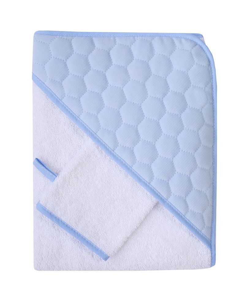 Rankšluostis pagamintas iš minkštos, pukuotos 100% medvilnės, gobtuvo dalis iš minkšto veliūro . Į komplektą įeina maudymo pirštynė.