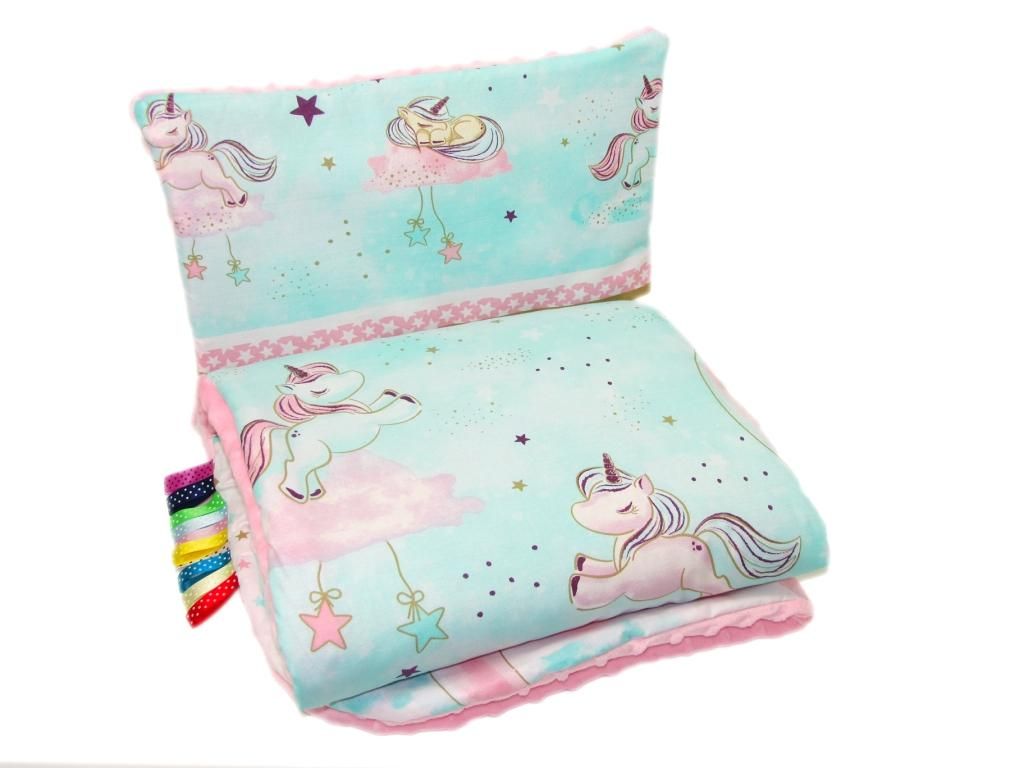 Aprašymas Komplektas kūdikio vežimėliui "Lovely unicorns" su turkio spalvos vienaragiais, minky rožinis
