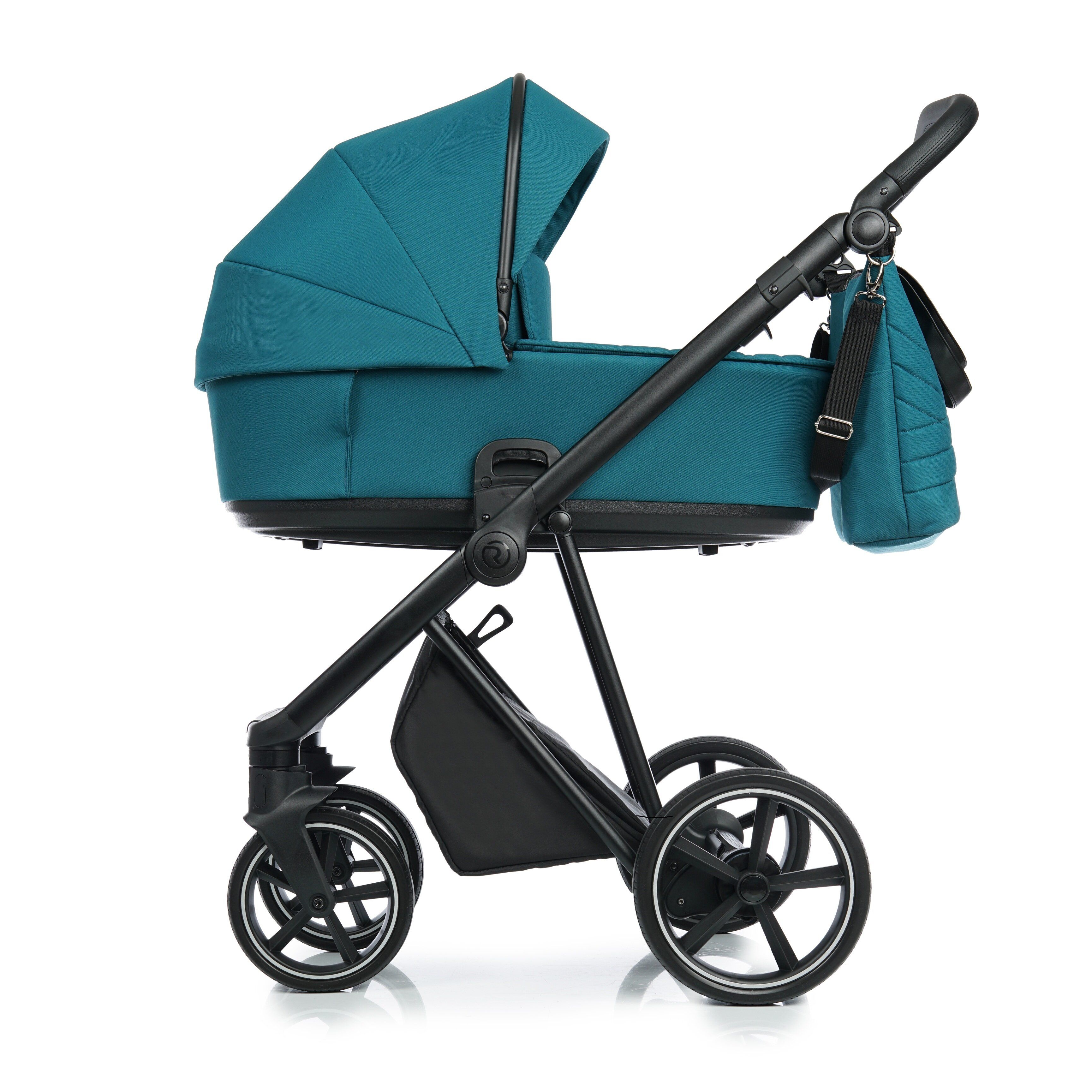 Reguliuojama rankena apsiūta EKO oda. Lengva ir patogi „Click“ sistema, skirta montuoti lopšį, vežimėlį ir auto-kėdutę.