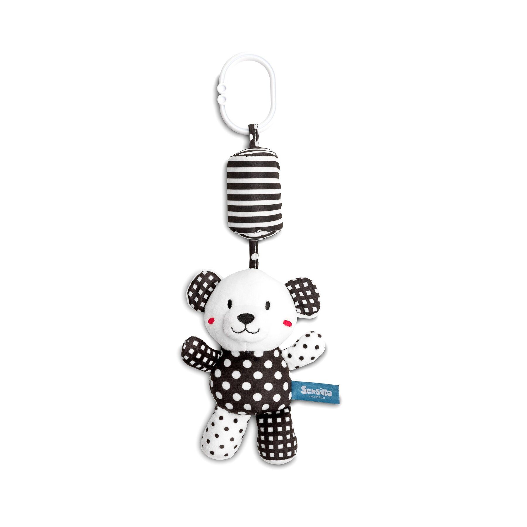 Sensillo Black & White pliušinis vežimėlio pakabukas patraukia vaiko dėmesį ne tik jam būdinga juodai balta spalva, bet ir maloniu ausiai varpeliu.