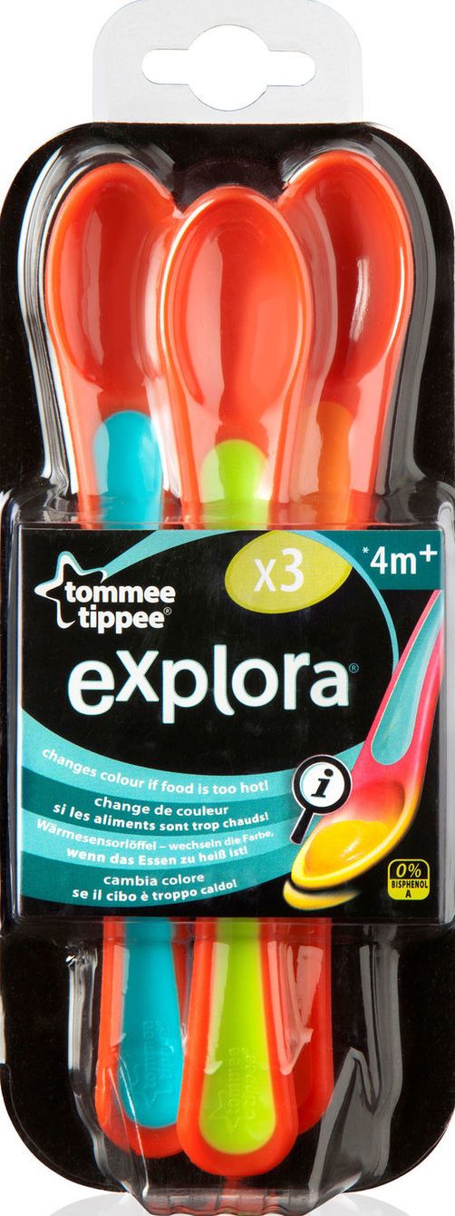 Tommee Tippee termo šaukšteliai kūdikiams, kurie iš raudonos tampi geltonos spalvos, įspėdami, kad maistas yra per karštas. Jie puikiai tinka maistui šildyti mikrobangų krosnelėje, nes žaibiškai parodys, kada maistą galima saugiai duoti vaikui, o kada ne.